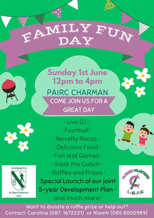 Clonard Volunteers LGFC and St. Johnβs Volunteers GAA Club are coming together for a Family Fun Day on